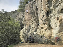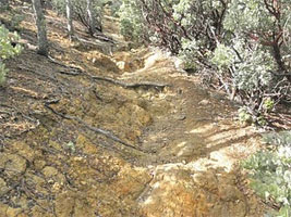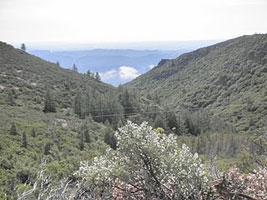 The Palisade's trail has been called Calistoga's stairway to heaven. I don't know about that, but it is a freakin awesome hike out to Table Rock. Walking in the Chaparral Notice that knobcone pines and chaparral plants such as manzanita and chamise become more common as you scramble up the streambed. Chaparral is a plant community composed of evergreen shrubs and short trees that are adapted to fire and drought-resistant. In fact, chaparral actually needs fire to propagate; a wildfire's extreme heat breaks down the tough coatings on the evergreens' seeds, making them permeable to water and able to grow. Chaparral (from the Spanish "chaparro," or thicket of oak shrubs) grows in areas with poor, rocky soil, hot dry summers, and limited rainfall (12-14 inches/year). As a result, it's found in just five places that have the right combination of warm landmass and cool ocean: California, South Africa, Western Australia, Southern Europe and South America. After less than half a mile, you'll reach a wide fire road. Carefully note your surroundings before you proceed; as you return this way later, the turn-off into the small streambed you just left would be easy to overlook. You may want to leave a handkerchief or some biodegradable trail marking tape to highlight the trail entrance. Turn left and walk uphill on the fire road. Note that from here on, the trail is exposed; be sure to protect yourself from the sun. This area features evergreen forests in the canyons lining the north-facing slopes, while chaparral dominates the south-facing slopes. Find a manzanita or chamise (chaparral). What adaptations to water scarcity can you see? Perhaps you've noticed that the branches, even the terminal branches that hold leaves, are thick, tough and woody. The small leaves may be small and leathery, and, they might hang vertically. All of these adaptations help minimize transpiration, water loss caused by the hot sun. Also because of water scarcity, manzanita living on the mountain's higher slopes will be more shrub-like than tree-like. As you climb, notice that prevailing winds from the west tend to sculpt plants that are higher on the mountain, making them look like they're almost ducking to escape each gust.