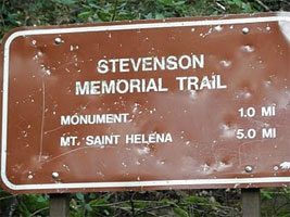 Mount St. Helena Hiking Trails. The Mt. St. Helena Trail starts your climb up the mountain about 300 feet west of the main parking area. The trail meanders at a gentle grade through forest for 3/4 mile to a stone monument, which marks the site where Robert Louis Stevenson spent his honeymoon in an abandoned mine building during the summer of 1880. From here, you climb more steeply and leave the forest to intersect the fire road. After a short walk, you can look down on the patchwork of the upper Napa Valley and beyond to Mount Diablo and Mount Tamalpais. As you continue on the south-facing slope of the mountain, you'll be surrounded by chaparral, and the higher up you go, the more exhilarating the view. At 3.6 miles, a road branches to the left leading to a ½-mile hike to the South Peak.