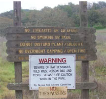 With some initial bond funds from the County, local volunteers, under the leadership of the SPCA, spent the next three years transforming the Skyline property into the public park they had promised a somewhat skeptical State of California that they would make. They installed fencing, a parking lot and an information kiosk. They forged trails. “ I remember riding my horse through the brush, finding the best route,” says one equestrian who participated in the early work. “I remember my husband and I and our friends tramping out the trails with our feet,” says another. “We had big work-parties and whole families came -- the kids helped too.” The park couldn’t open without restrooms, so chemical toilets were installed.